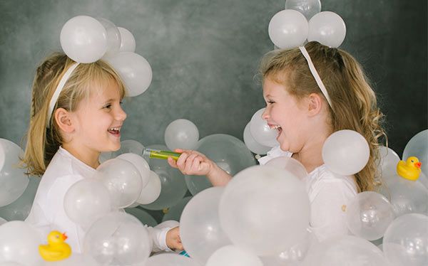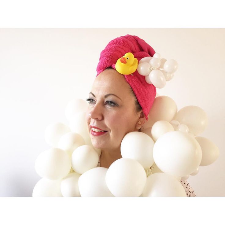 Mit weißen Luftballons kannst Du dich prima als Schaumbad verkleiden. Dazu ganz weiß anziehen und weiße Luftballons in verschiedenen Größen aufblasen und an der Kleidung anbringen. Zusätzlich noch ein paar Luftballons mit Handtuch und eine Badeente Alternativ geht auch ein Haarband aus Frottee oder eine witzige Rüschen-Badekappe.