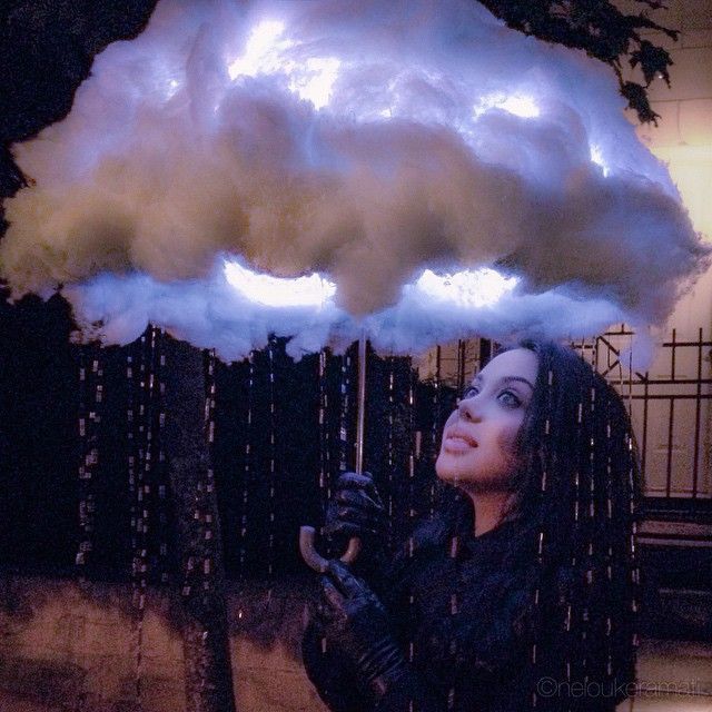 Für Paare eignet sich die Variante oben, die sicher selbsterklärend ist. Willst du alleine blitzen, dann beklebe einfach einen alten Schirm mit Wattestreifen und bausche sie ordentlich auf. Als Gag kannst du batteriebetriebene LED-Streifen hineinkleben. Toll, wenn sie Farbwechsel oder Blinkeffekt haben.