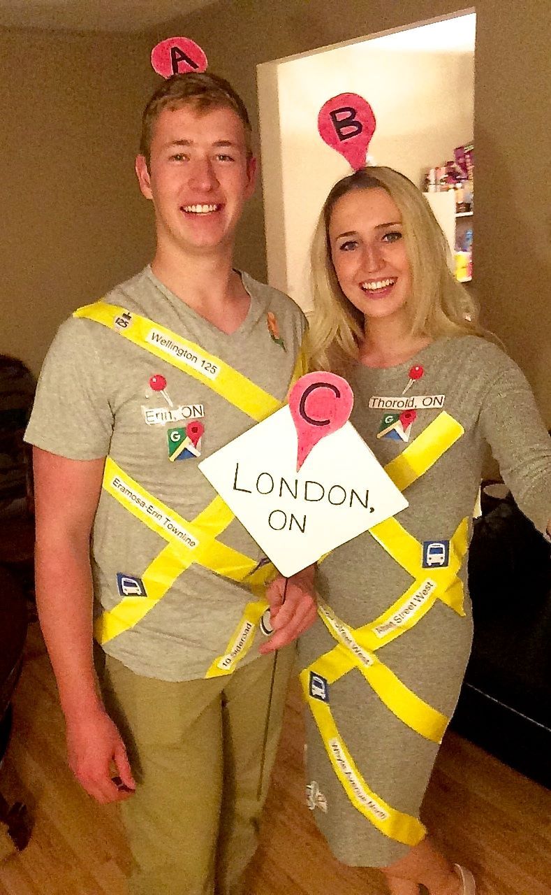 Nimm ein graues Shirt und beklebe es mit gelbem Klebeband. Die Buchstaben werden auf roten Bastelkarton gemalt und die Straßennamen und Symbole kannst du Googlen und Ausdrucken oder du erfindest einfach selbst Straßennamen. Originell ist es auch, wenn du deine eigene Straße als Ziel anbringst.