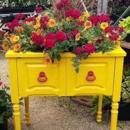 Alte Kommoden, wetterfest lasiert, sind ideale Blumenkästen.