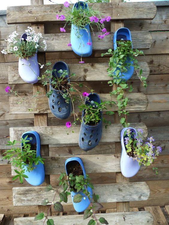 Schuhe, Crocks oder Gummistiefel lassen sich prima bepflanzen und sorgen für farbenfrohe Farbkleckse in deinem Garten.